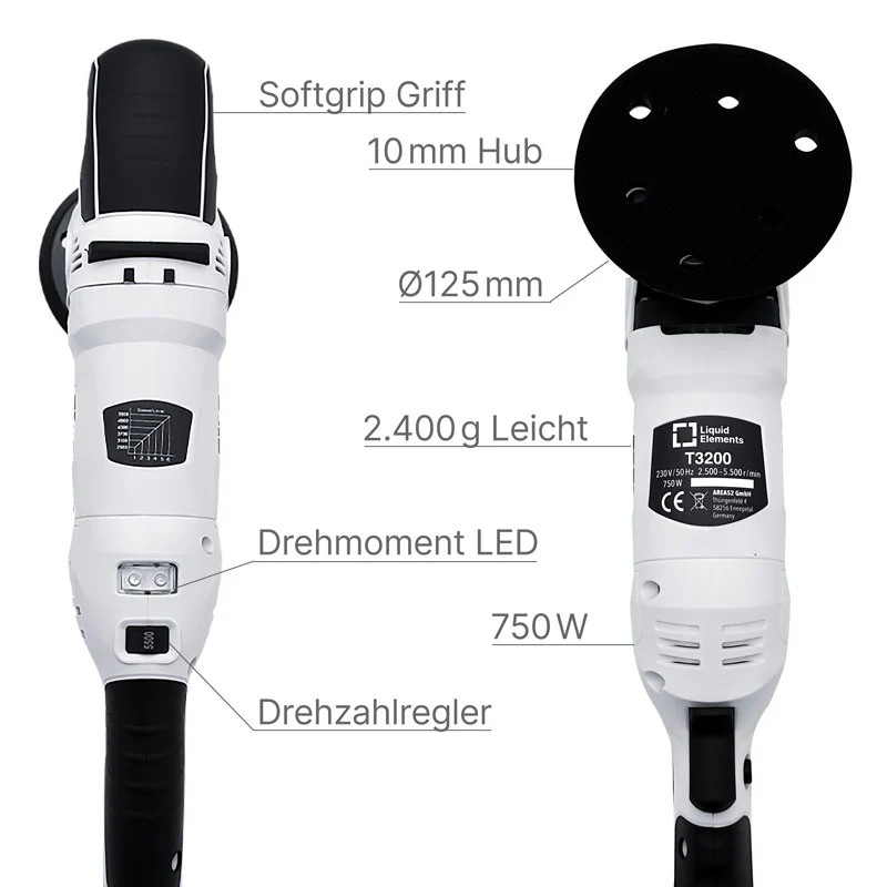 Ergonomikus kialakításának köszönhetően a "T3200" excentrikus polírozó kényelmesen tartható, még hosszabb polírozási munkamenetek során is. Mindössze 2,4 kg-os súlyával elég könnyű a kényelmes kezeléshez, ugyanakkor stabil és erős ahhoz, hogy még a legigényesebb feladatokat is elvégezze. A hosszú, 8 méteres kábel maximális mozgásszabadságot biztosít, így könnyedén dolgozhat a jármű körül anélkül, hogy folyamatosan váltogatnia kellene a konnektorokat.
