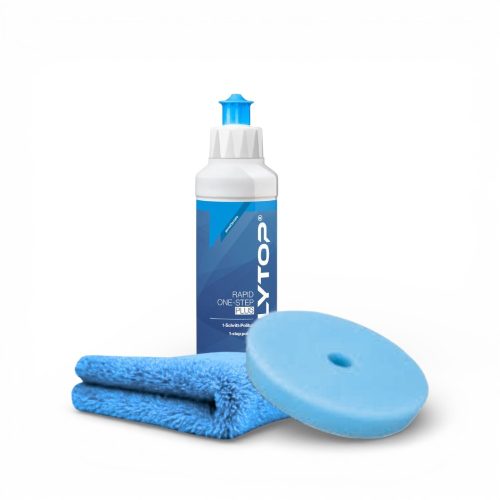 A csomag tartalma: Polytop Rapid One Step Plus 250 ml egylépcsős polírozópaszta, hozzá fejlesztett kék One Step polírozópad és 360 GSM prémium mikroszálas törlőkendő a gyors, látványos és tartós eredményért
