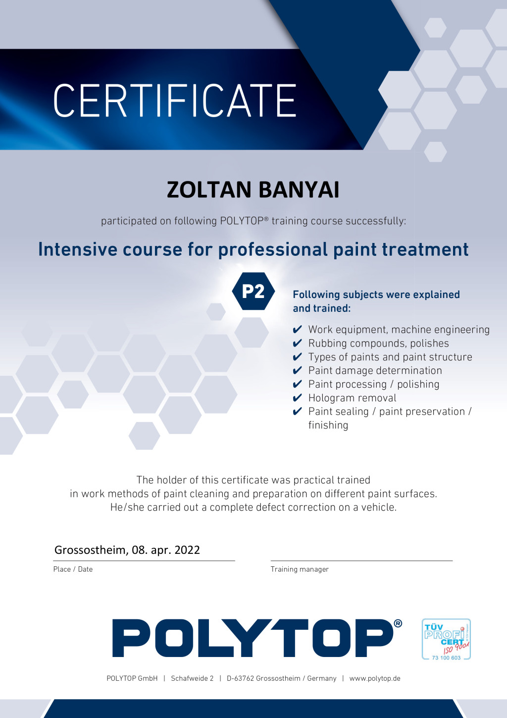 POLYTOP festékjavítás - fényezéskorrekció akkreditált státusz megszerzése